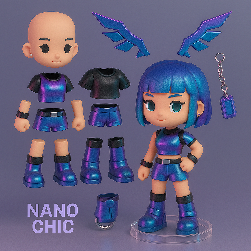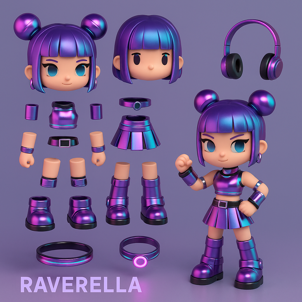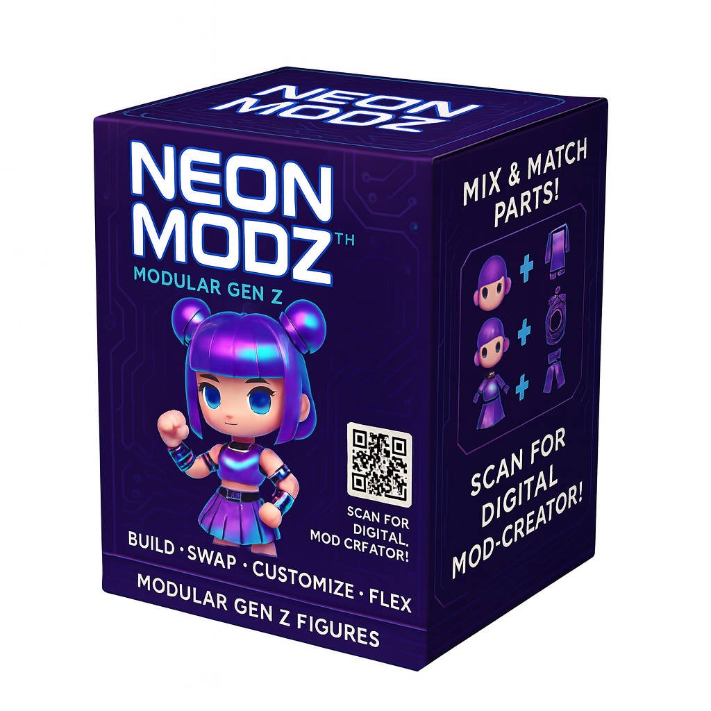 NEON MODZ™ is een modulair blindbox-universum voor Gen Z. Elke box bevat een volledig assembleerbare figurine met verwisselbare haarstijlen, outfits, accessoires en tech-gadgets. De look is geïnspireerd op digitale rave-cultuur, cyber fashion en creator lifestyle.